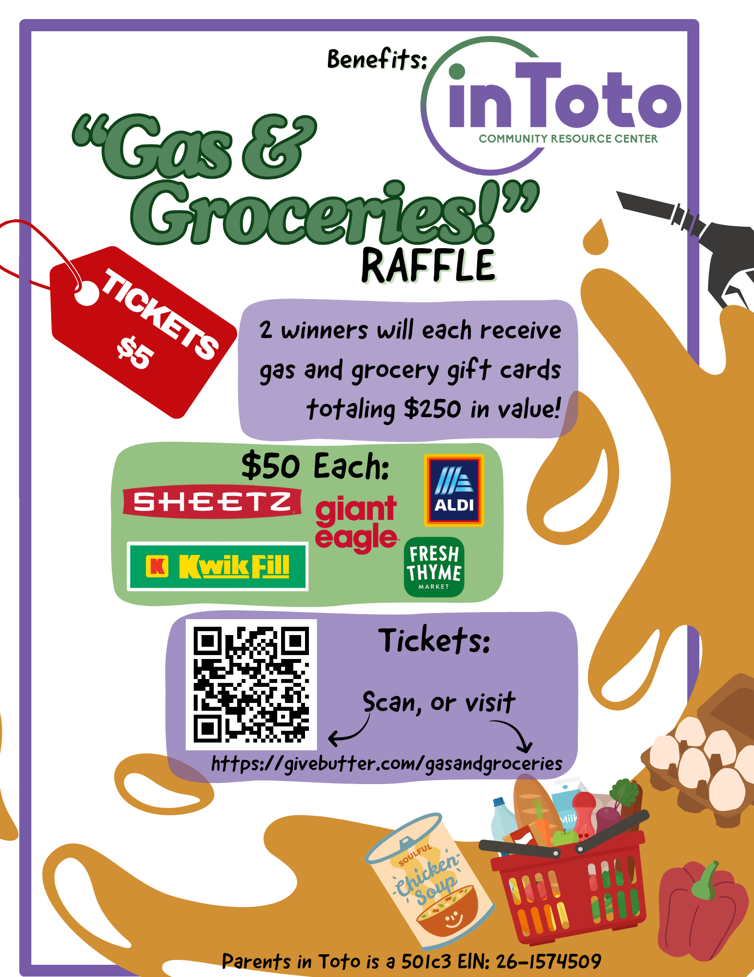 Fuel your fall with Toto’s Gas & Groceries raffle: 2 winners will each receive gas and grocery gift cards totaling $250 in value! Each winner will receive a $50 gift card to Sheetz, Kwik Fill, Giant Eagle, Fresh Thyme, and Aldi. Tickets are $5 each and can be purchased online through 11/01/2024.
